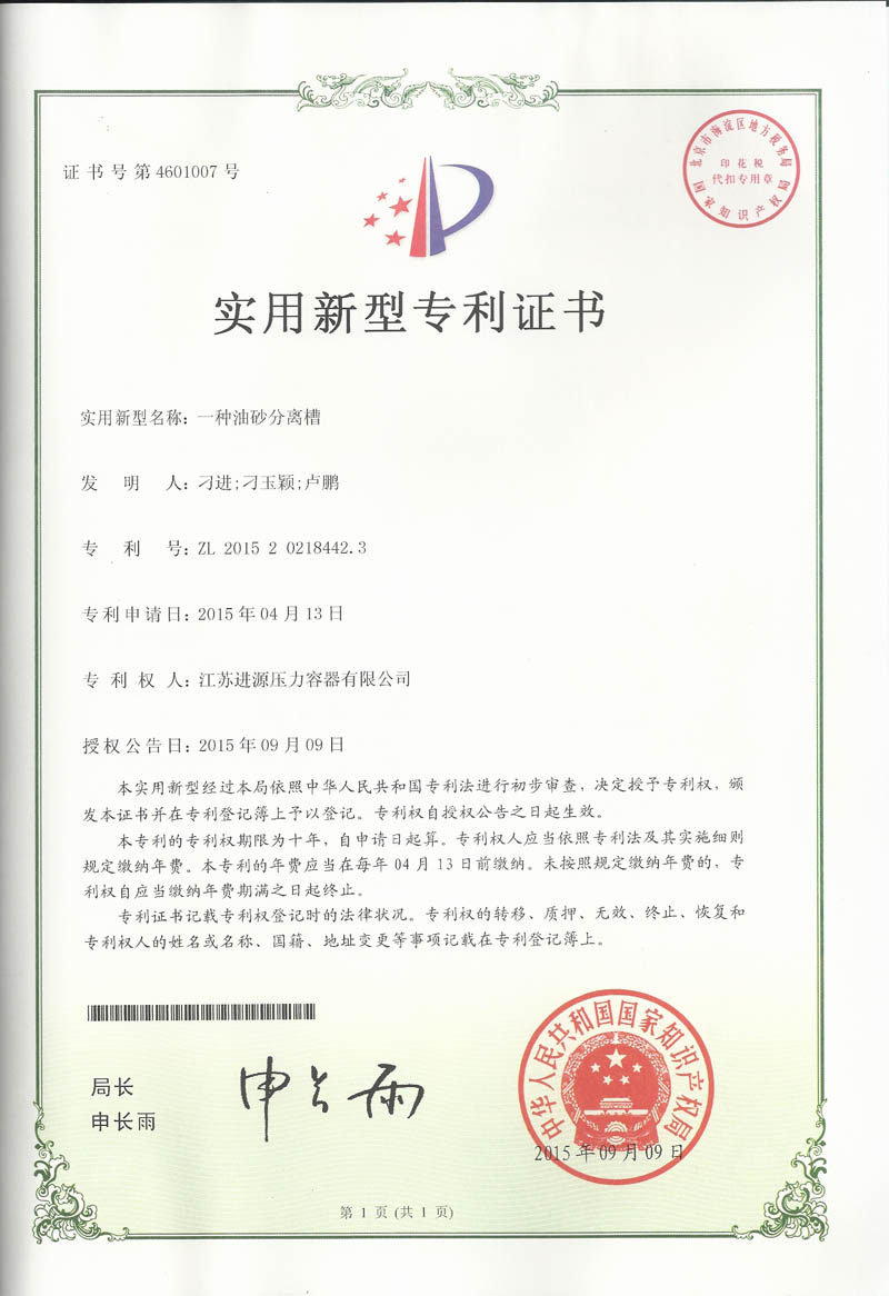 江蘇進源壓力容器有限公司自主研發的“一種油砂分離槽”、“一種反應釜攪拌器”、“螺旋板換熱器”、“一種高效節能蒸發式冷凝器”等四項創新成果,均獲得國家知識產權局專利授權,專利期限為十年。另外申報的15項發明專利也被國家知識產權局受理。